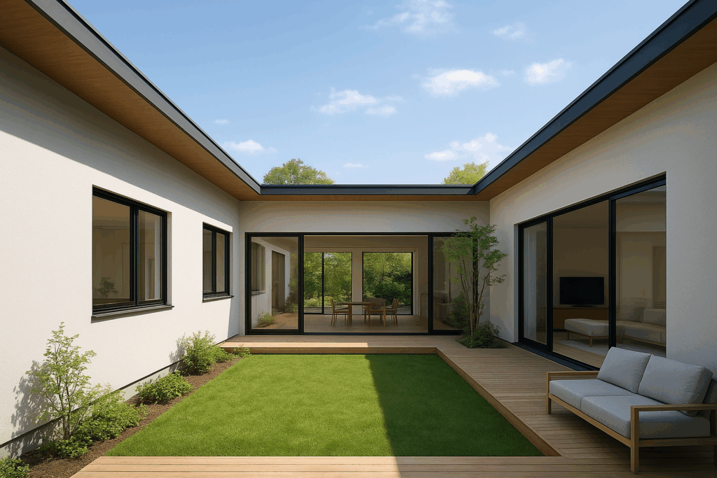 コの字型平屋は、間取りが「コ」の字のように3方向に建物があり、真ん中が中庭になっている形の家のことです。