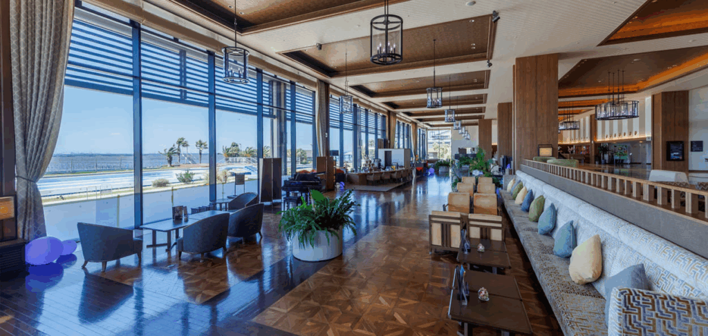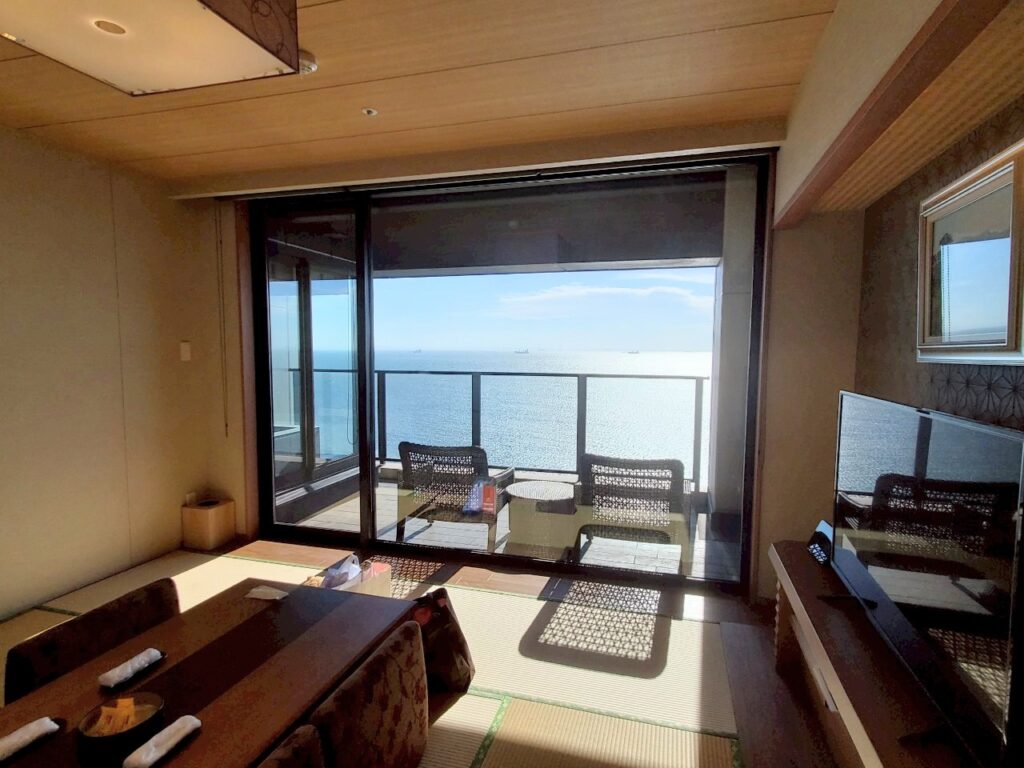 館内に入ると、広々としたロビーと大きな窓から海が見えてテンションアップ!