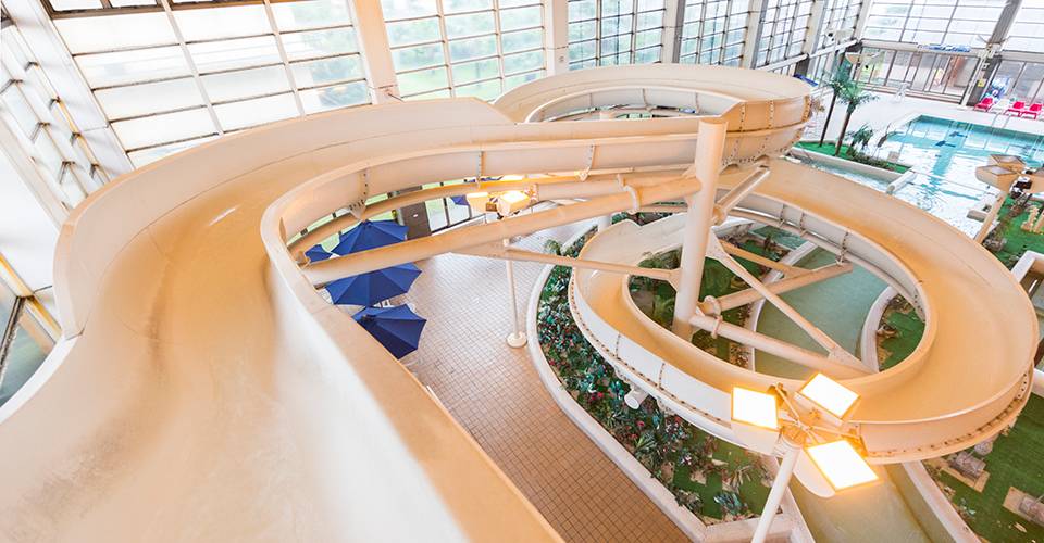 更衣室を出ると、まずは室内プールに繋がっています。室内には流れるプールが2カ所とウォータースライダーが1つあります。